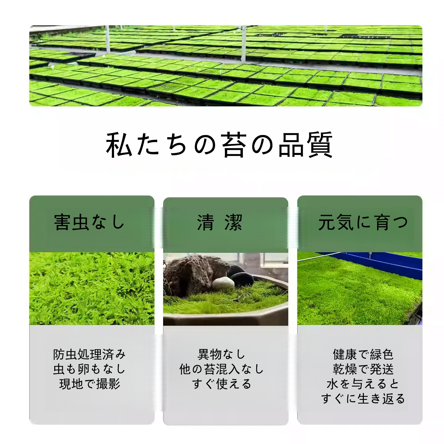 私たちの苔はすべて人工栽培によって育てられています。