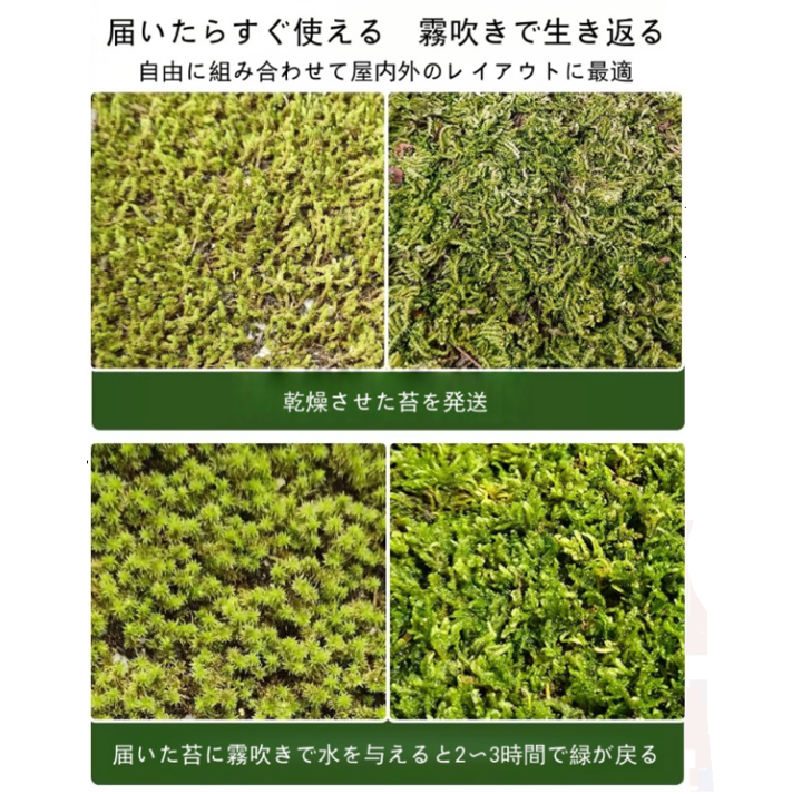 乾燥した状態で発送いたしますが、届いた苔に霧吹きで水を与えると数時間で生き生きとした緑を取り戻します。